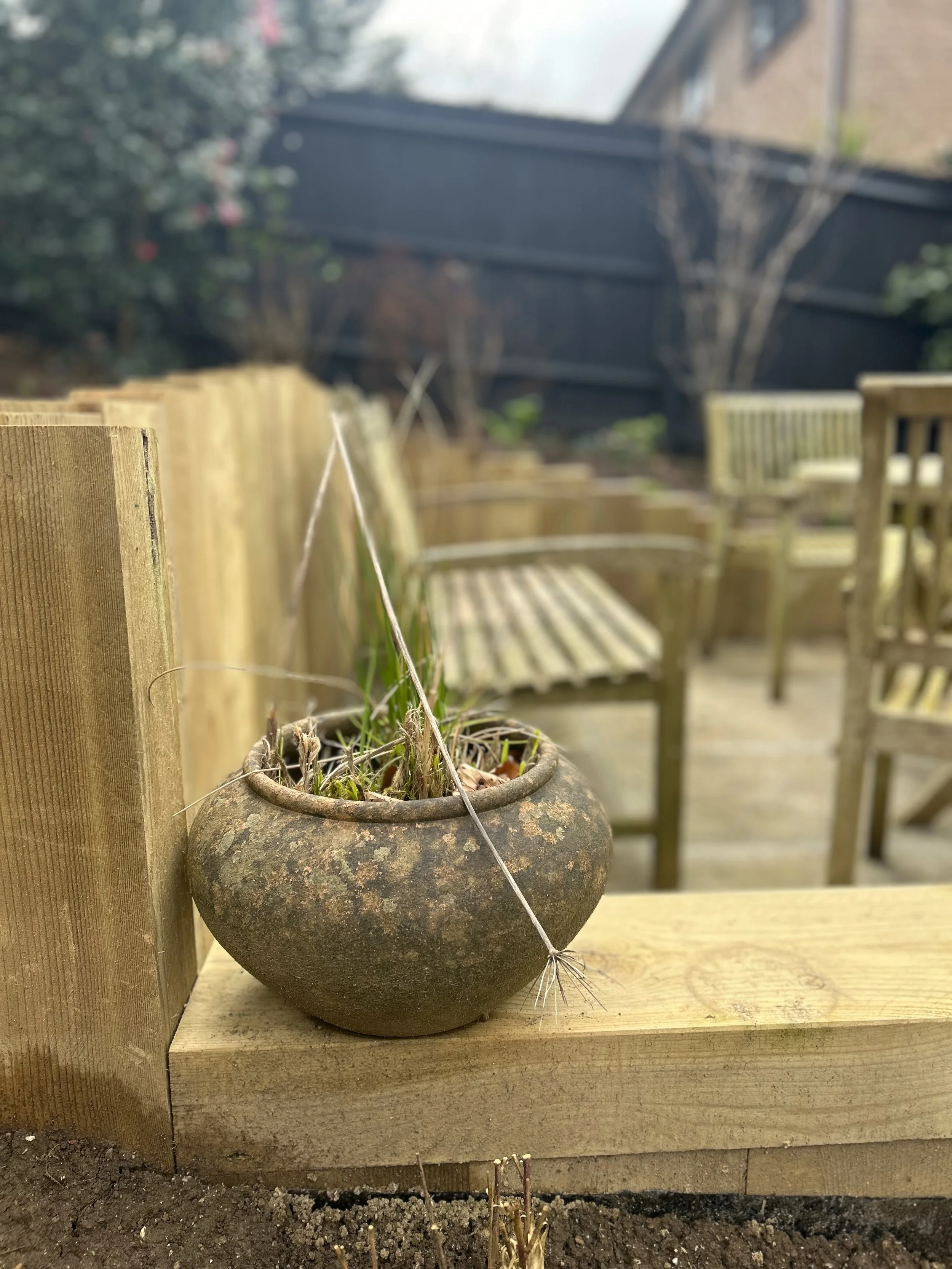 Timber sleepers were used throughout the garden as a unifying feature of the new elements. The raised beds, veg plot seating area, top bench seating area and main patio retaining wall all utilised sleepers. This natural material also served to help soften the existing hard landscaping in the garden, which was otherwise quite dark.
